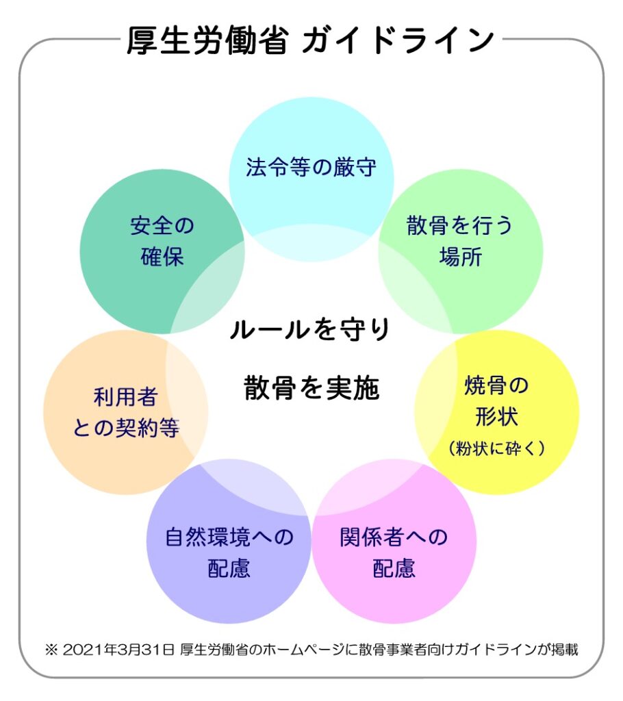 「散骨って法的に問題はないの?」と良くご質問されます。色々なメディアにも「散骨は合法です。」表記されていることが多くありますが、実際のところ散骨の行為に関連する法律はありますが、「散骨」に適応した法律は無いのが現状です。1991年10月に葬送の自由をすすめる会が「葬送の自由」を掲げ、戦後初となる海洋散骨を「自然葬」と名付けて実施し、それ以降多くの海洋散骨が行われてきました。その間、関連する法律の解釈が難しい中、散骨業者や関連団体などが自主規制を設定し、ルールやマナーの厳守して散骨を実施していた経緯もあり、2021年3月厚生労働省のホームページに「散骨に関するガイドライン(散骨事業者向け」)が公表されました。以上のことからも「祭祀の目的を持ってルールやマナーを厳守して行う散骨」の場合には、違法性は無いと解釈できると思います。